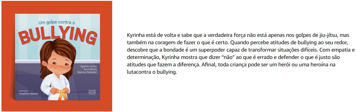 O livro Um Golpe Contra o Bullying traz uma história inspiradora sobre coragem, empatia e o verdadeiro significado da força. Acompanhamos Kyrinha, uma menina cheia de determinação, que aprende no jiu-jítsu que a verdadeira vitória está em fazer o que é certo e em defender quem precisa de ajuda.